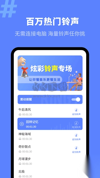 告别一成不变的系统来电铃声,无需连接电脑 任意挑选,一键快速换铃声 100%设置成功,热门流行的铃声想换就换,最火的抖音神曲,即刻呈现。