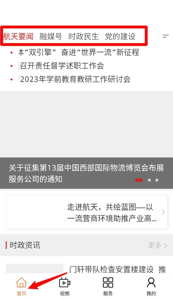 1. 打开应用,进入“首页”,即可查看航天要闻、融媒号、时政民生以及党建等新闻资讯内容分类。