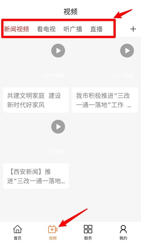 2、点击下方的“视频”标签,即可观看新闻视频、电视直播或者广播节目,通过切换分类,还能了解到更多音视频内容。