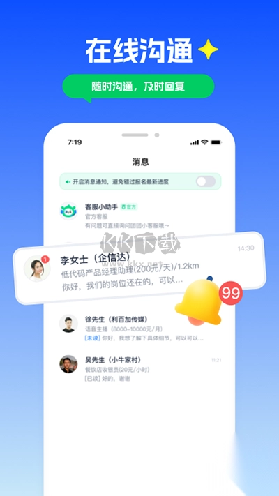 青团社兼职软件了便捷的沟通工具,用户可以直接与雇主或招聘方进行在线沟通,了解兼职详情和面试安排;这样,用户可以更加方便地与雇主进行交流,提高求职效率;