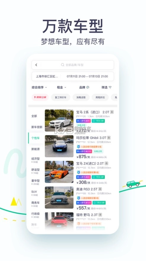 【海量车型任你选】涵盖超100个品牌,大众、保时捷、宝马、奥迪、奔驰、丰田、别克、特斯拉、蔚来、吉利、哈弗、比亚迪等众多品牌一应俱全;万款车型琳琅满目,奥迪A6L、宝马3系、宝马5系、奔驰E级、奔驰C级、大众帕萨特、别克GL8、丰田凯美瑞、大众朗逸、日产轩逸、野马、Z4、Boxster等,无论你心仪哪款,这里都能满足。