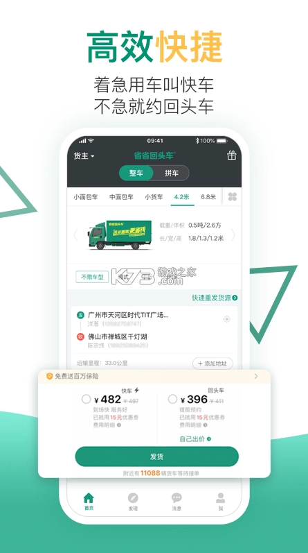 要是着急用车,那就叫快车;不着急的话,约回头车更划算,省省回头车就是绝佳选择。无论是送货、搬家,还是发物流、拉货、发货、提货,省省回头车都能让物流变得更便捷!对于货主来说,预约叫车能省下不少钱;对司机而言,拒绝空返接货可以增加收入。