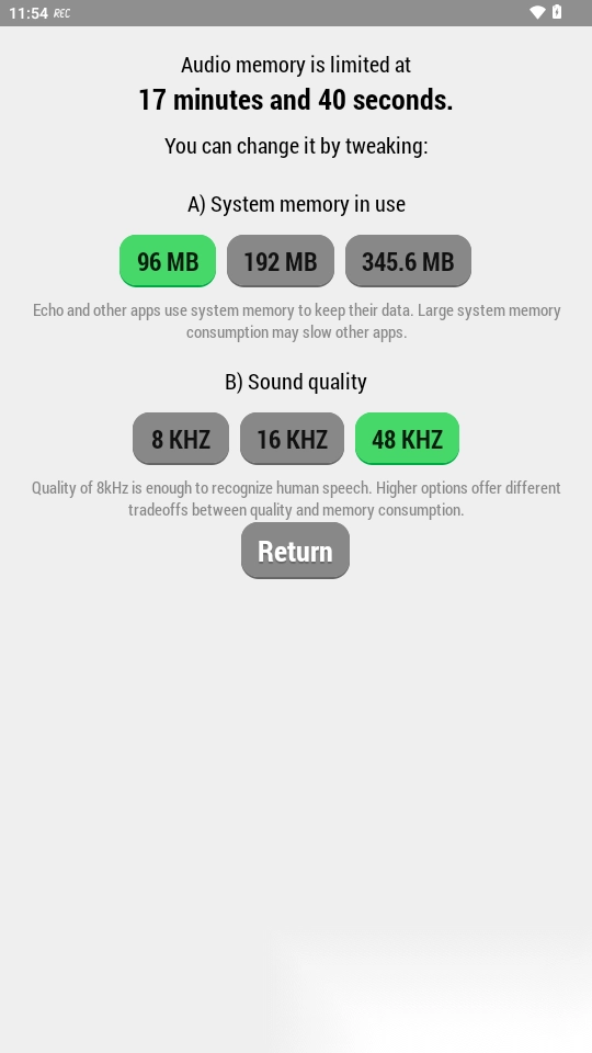 在设置页面,可以修改音频内存限制,最大 460.8MB 可以录制 70 分钟。