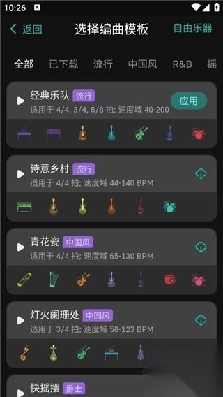 4、丰富海量的创作模板:涵盖和弦模板、曲风模板以及作品曲库,支持多种风格自由切换,还能搭配各式各样丰富的音色与奏法。