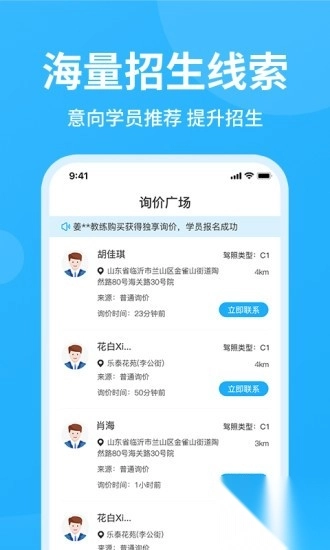 教练入驻教练精灵后,能够实时接收来自驾考精灵上咨询学车的学员信息。要知道,驾考精灵坐拥千万学员,切实能够助力驾校解决招生难题。