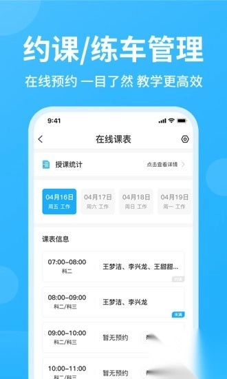 教练公布练车日程,学员可一键预约,练车安排清晰明了。采用省心的智能管理模式,实时向学员通知考试安排,并让学员及时知晓考试结果。