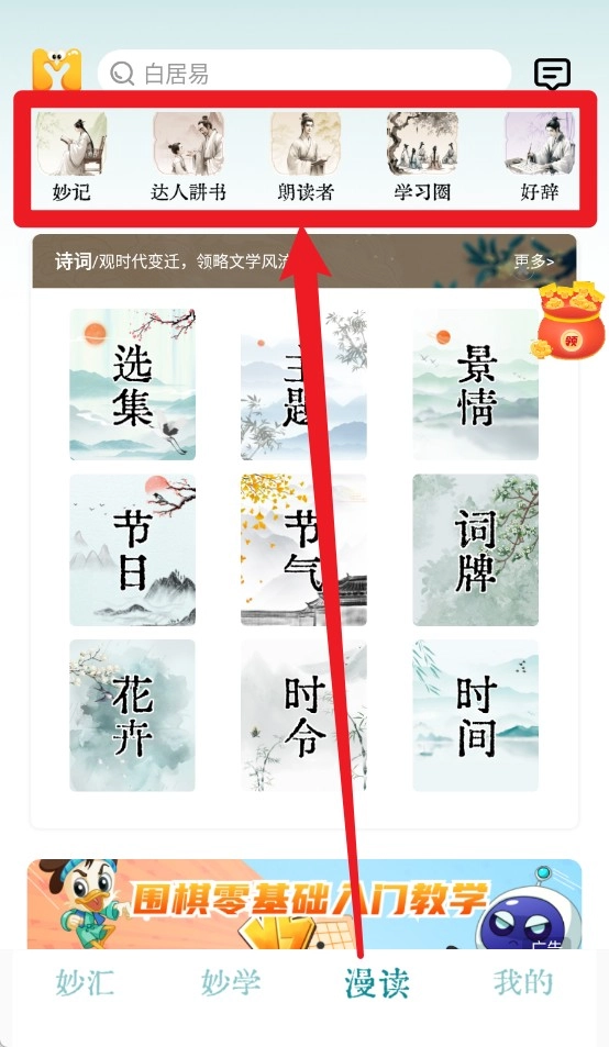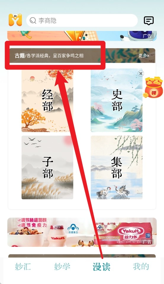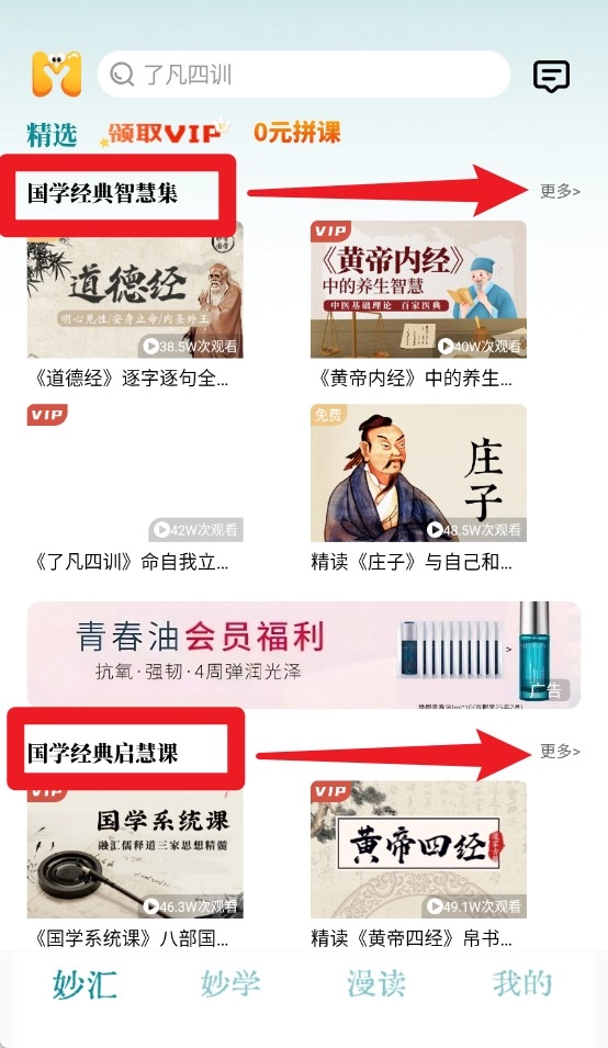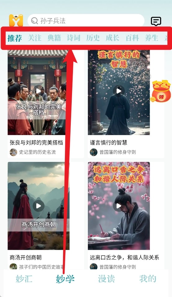 1、点击“妙汇”,学习诸子百家与古文经典内容。