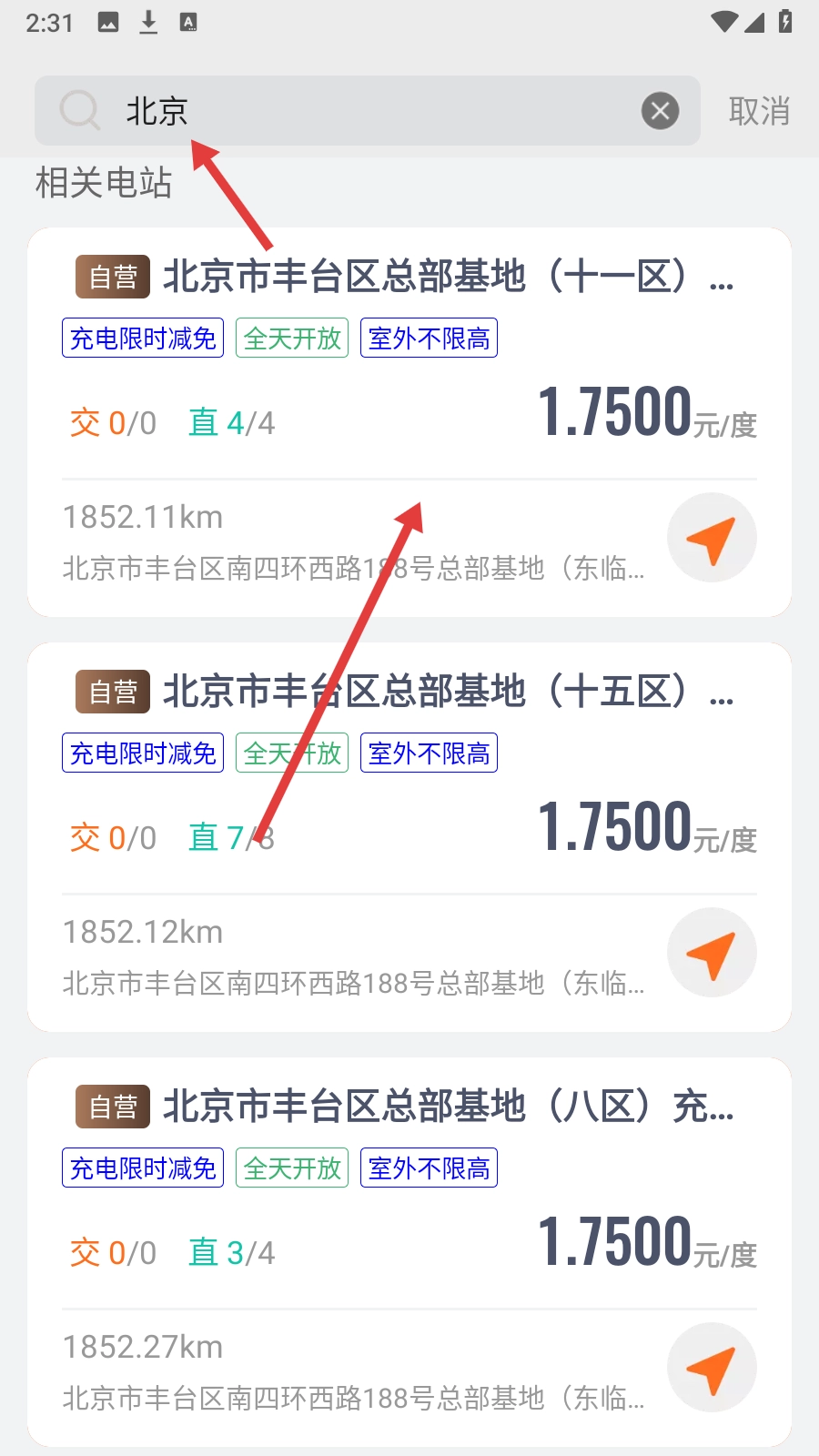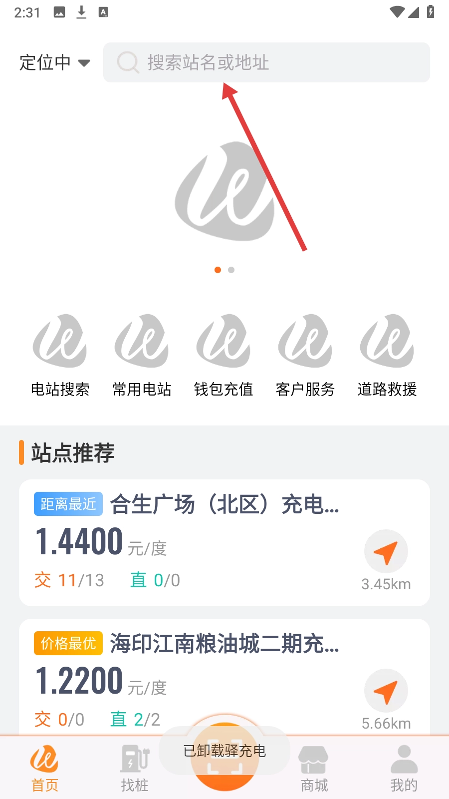 2、在搜索页面输入【用户所在位置】,查看相关电站搜索结果。