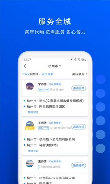 3、于主界面,能够看到附近的专车。在界面上方,可依据自身选择,满足送宠物、长途急件、帮忙办事等需求。
