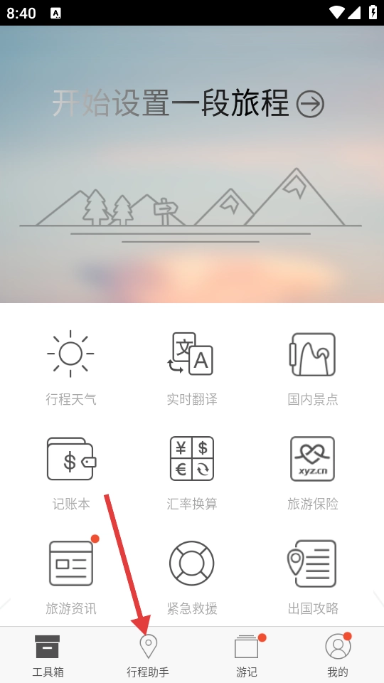 1、打开APP后,点击底部导航栏的【行程助手】,进入行程助手页面。