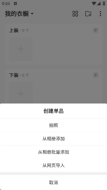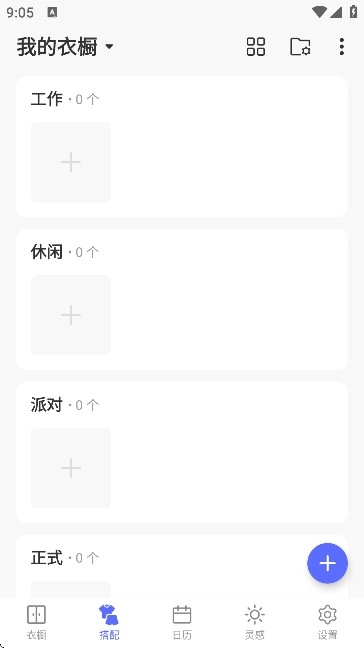 3、打开软件,进入【衣橱】首页,具体页面展示如图。在此页面,可通过点击【+】,添加诸如上装、夏装、鞋子包包等各类服饰信息。